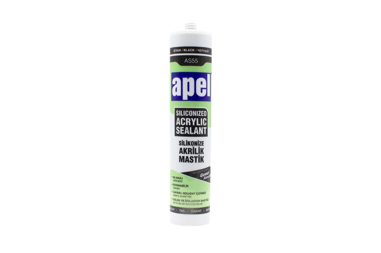 APEL AS55 Akrilik Mastik Siyah, su bazlı akrilik esaslı, yüksek yapışma gücüne sahip bir dolgu ve sızdırmazlık malzemesidir. Elastik yapısı sayesinde çatlama yapmaz, boyanabilir özelliğiyle uygulandığı yüzeyle uyum sağlar. Siyah rengi ile özellikle koyu yüzeylerde estetik bir çözüm sunar.